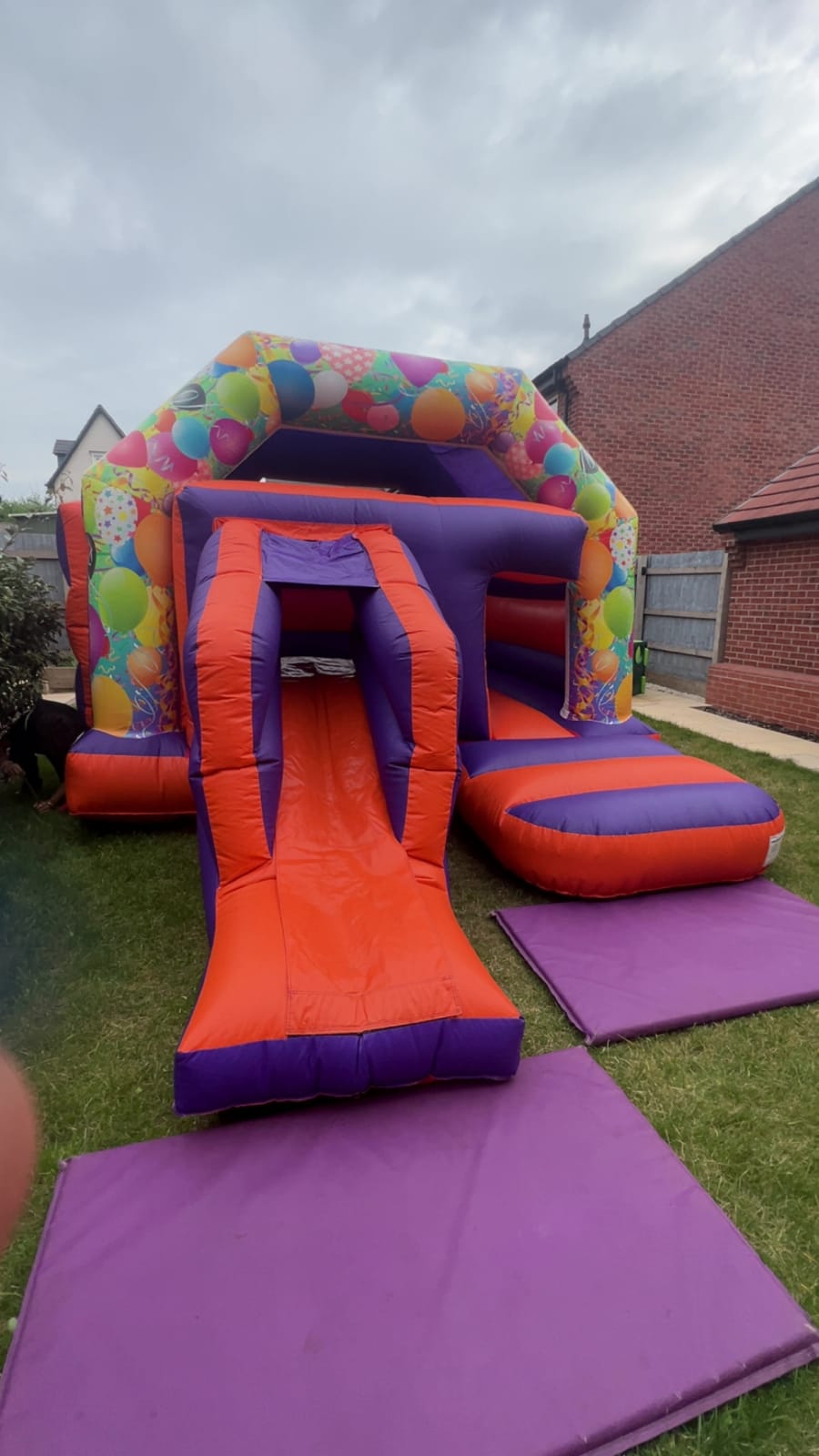 The Orange Combo 16x13 is a colorful inflatable perfect for parties, school events, and family fun. Bright orange and purple colors with a balloon motif catch the eye. A front-facing slide adds excitement. Compact size fits most gardens and venues. Available for delivery across Nottingham, Derby, Mansfield, and surrounding areas 🚚.