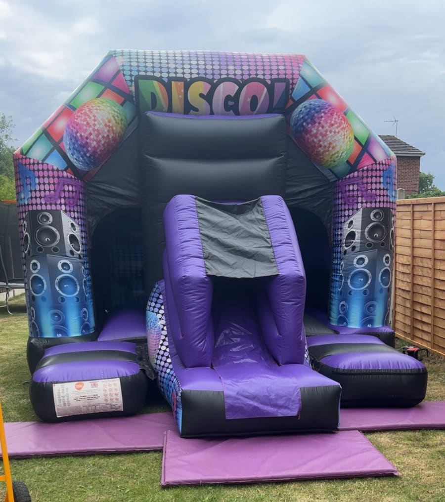bouncy castle hire in Nottingham introduce the Black slide combo 16x13 in Nottingham, Derby, Mansfield, surrounding areas — a 16x13 black and purple slide combo bouncy castle with a bold disco design. Ideal for birthday parties, school fetes, and community events. Eye-catching disco prints and a built-in slide keep kids active and entertained. Perfect for evening parties thanks to reflective disco panels.