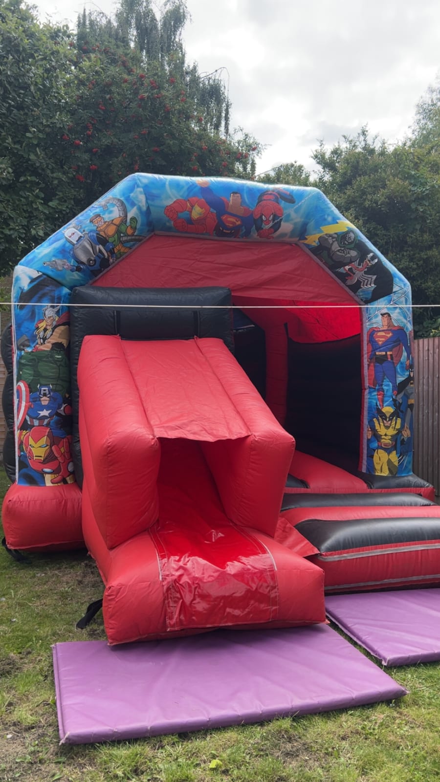 The Superhero slide combo 18x14 is an 18x14 black and red bouncy castle with a slide on the front and eye-catching superhero design. It delivers high-energy fun and safe play for kids. Ideal for birthdays, school fetes, community events, and family parties. Available for hire in Nottingham, Derby, Mansfield and surrounding areas. Fast setup. Strong visuals. Non-stop smiles. 😄