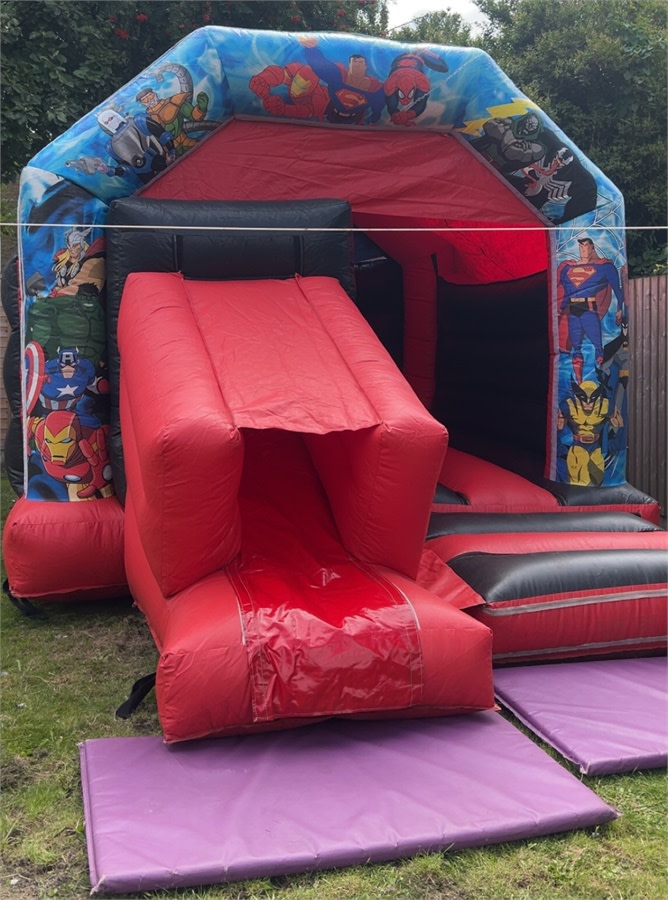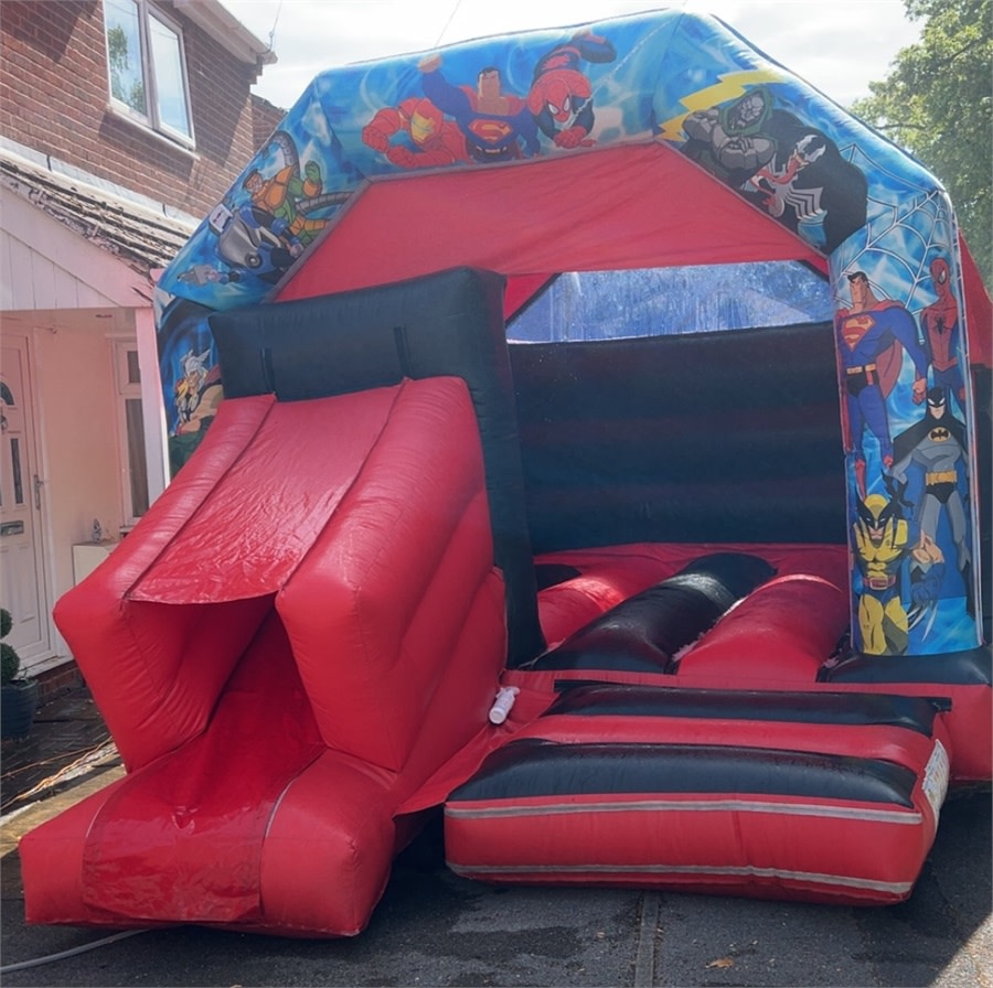 The Superhero slide combo 18x14 is an 18x14 black and red bouncy castle with a slide on the front and eye-catching superhero design. It delivers high-energy fun and safe play for kids. Ideal for birthdays, school fetes, community events, and family parties. Available for hire in Nottingham, Derby, Mansfield and surrounding areas. Fast setup. Strong visuals. Non-stop smiles. 😄
