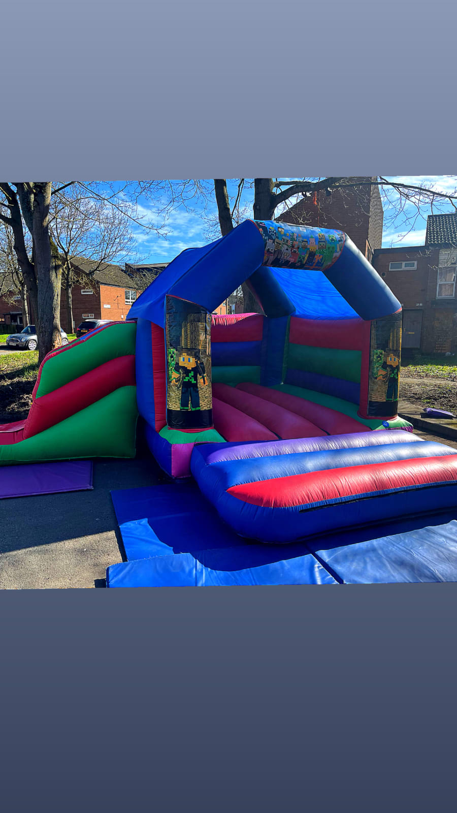At Nottingham Bouncy Castle Hire, we supply clean, fully insured inflatables with reliable delivery, professional setup and safe collection. Our Minecraft combi castle is ideal for both indoor venues and outdoor garden parties.